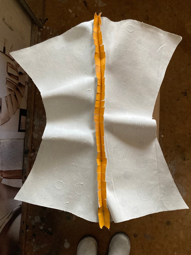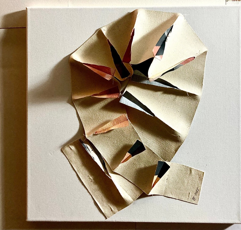 So I dug out the rolled up canvases, and made my homage – I just had to get it ‘off my chest’ in some way…. as it happened, it turned out to be a really useful exercise, as I found a few other ‘samples’ I’d made – ideas of shape and form from painted canvas, which after all is sturdy cotton fabric to begin with, made sturdier by the fact it is ready painted with oil or acrylic paint or both. This makes it really good at holding the shapes made by the cutting and sewing – they become sculptural as a result. I found three, and made another three to accompany them.