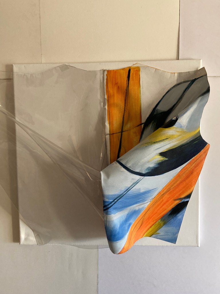 Repurposed painted canvas sections mounted on 40cm square stretched canvas.Depth 3cm