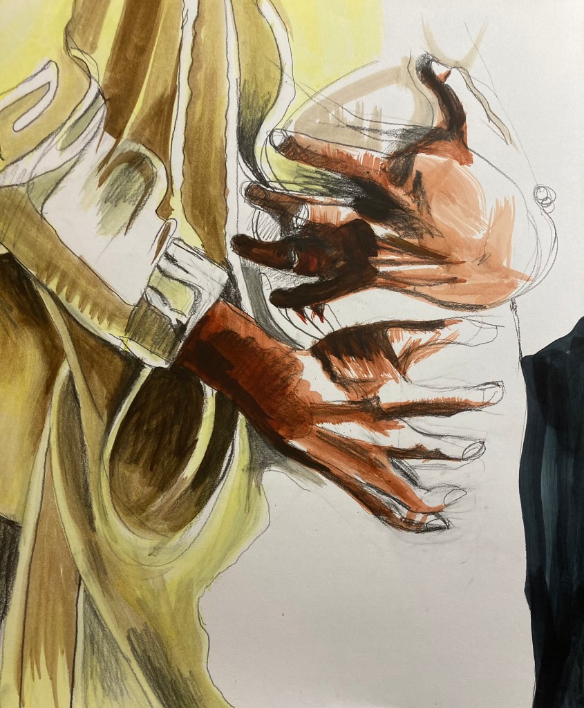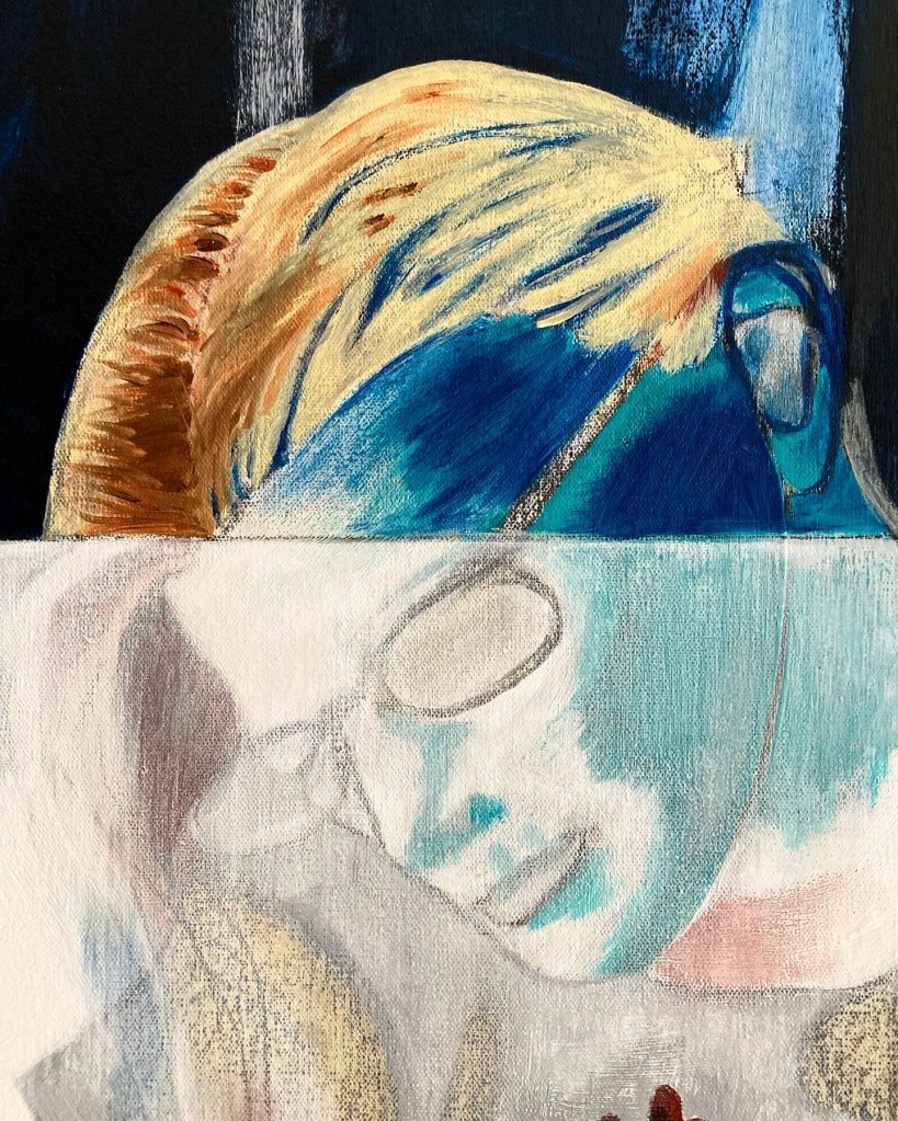 ‘Vinyl Mask’ 2022.‘Blue Gap’ detail‘Blue Gap’ painting‘Notadiptych’, 2021. 100x 150cm‘Mondrian Hard Mix’ 2021 100 x 120cm£750, ‘Water Woman’ 2022, Oil & oil pastel on 425gsm watercolour paper, 56 x 76cm, .£800’Real / Unreal’ 2022, Oil pastel, oil, graphite on heavy watercolour paper, 76cm x 56cm‘Hold’ 2022.‘Blue Silhouette’ 2019 Oil, acrylic and clear vinyl strips.‘Vivid Vintage Grad’, Oil and charcoal om canvas, 76cm x 101cm2022