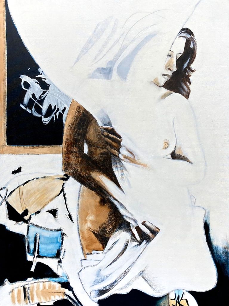 ‘Keystone Capri’ 2023. Oil & acrylic on canvas, 80cm x60cm‘Nikon Girl’ 2023, Oil, acrylic and graphite on canvas. 102 x 102cm‘Blue Gap’ painting‘Blue Gap’ detail‘Vivid Vintage Grad’, Oil and charcoal om canvas, 76cm x 101cm2022‘Vivid Vintage Grad’ crop, oil and charcoal on canvas, 75 x 102cm, 2022‘Notadiptych’, 2021. 100x 150cm‘Mondrian Hard Mix’ 2021 100 x 120cm ‘Mondrian Fresh Mix’, Oil, acrylic and charcoal on canvas 100 x 120cm, 2021‘HUG#2’ 2021, 100cm x 120cm ‘HUG#1’ 2021, 100cm x 120cm We Don’t Dress UP Anymore’ 2021, Oil, acrylic and graphite on canvas, 76 x 101cmWe Don’t Dress Up Anymore’ 2021, Oil, acrylic and graphite on canvas, 76 x 101cm‘Blue Silhouette’ 2019 Oil, acrylic and clear vinyl strips.‘Shirt#1’, Oil, acrylic, graphite, wire hanger, waxed cotton thread, gaffer tape on canvas, on plywood. H 90cm x W 110cm x D 2cm ‘Shirt#2’, Oil, acrylic, graphite, wire hanger, waxed cotton thread, gaffer tape on canvas, on plywood. Dimensions: H 110cm x W 90cm x D 2cm‘Folded Circles#1’,