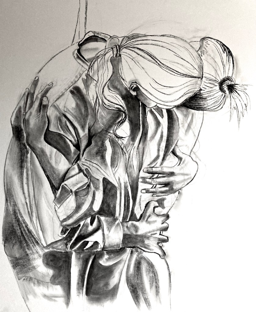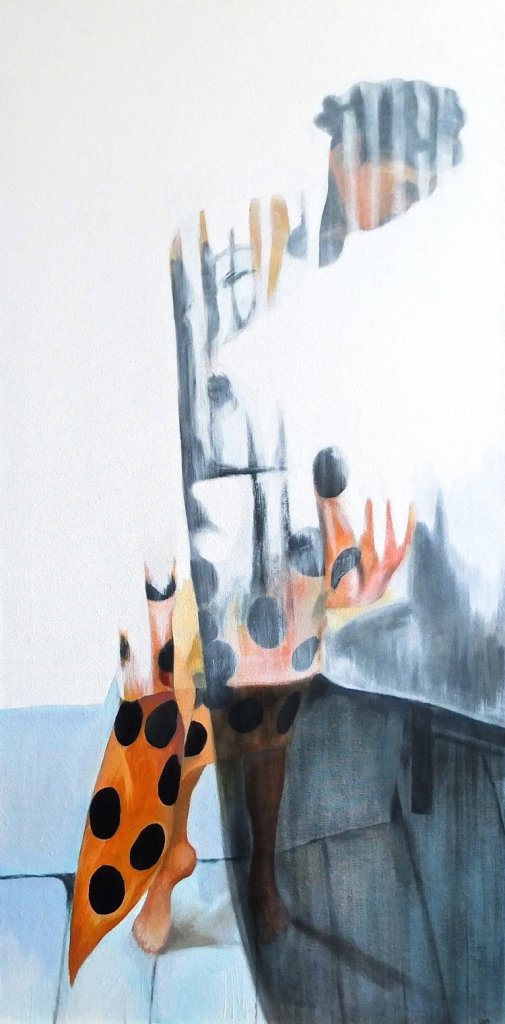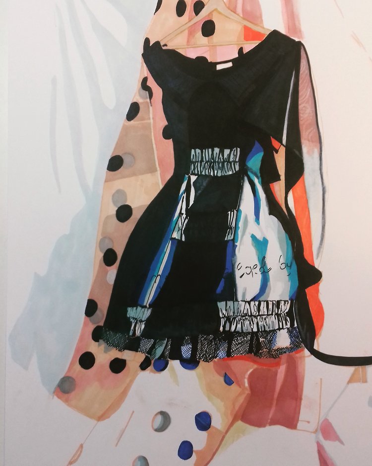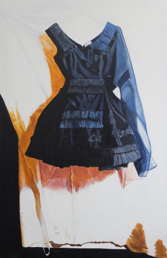 Oil and charcoal on Fabriano paper.‘Big Twist’, 2020, Oil and charcoal on Fabriano paper. 100cm x 70cm‘Diagonal Clutch’, 2020, Oil and charcoal on Fabriano paper. 100cm x 70cm‘Wrapped’, 2020, Oil and charcoal on Fabriano paper. 100cm x 70cm‘Wrapped & Twisted’, 2020, Oil and charcoal on Fabriano paper. 100cm x 70cm‘Light Striped’, 100cm x 80cm‘Disappearing Polka’, 100cm x 50cm‘Silhouette’ 40″ x 30″‘Yellow Flags’ ‘Yellow & Purple Irises’‘3 Leaves in the Park’‘Mondrian Stitch Up’, Oil on canvas, collage, appliqué, waxed thread hand stitching, machine stitching, 35cm x 48cm, 2019‘The Black Wedding Dress’, 36″ x 24″